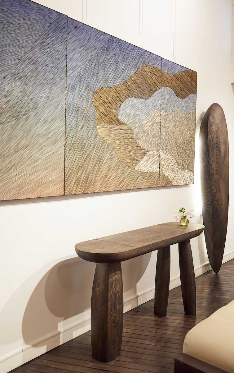 Présentée à la galerie Anne Jacquemin Sablon, la collection s’intitule Érosion. Un nom évocateur, inspiré par les plages du Nord, si chères au designer, aujourd’hui durement touchées par ce phénomène. L’ensemble réunit une table, une stèle, une coiffeuse, une table de chevet, ainsi qu’un étonnant canapé de conversation – ou plutôt un dos à dos.