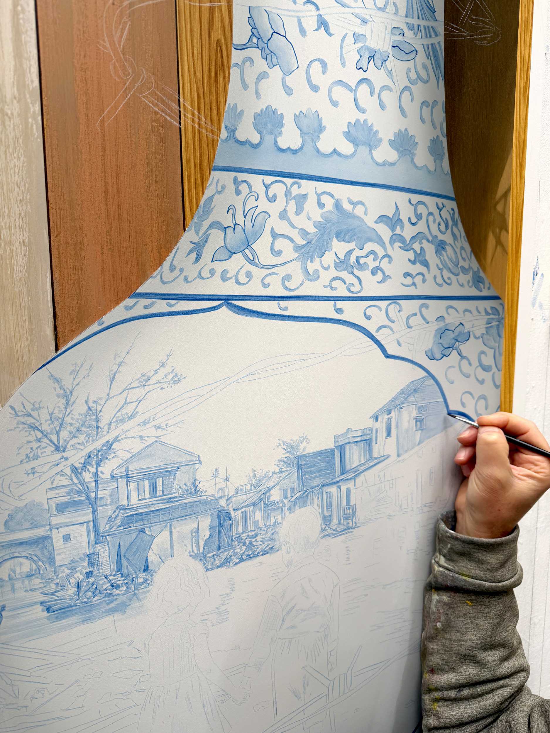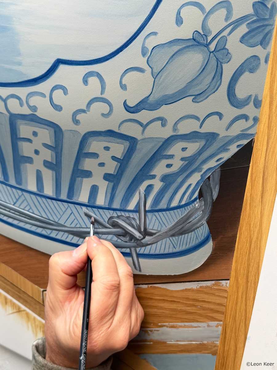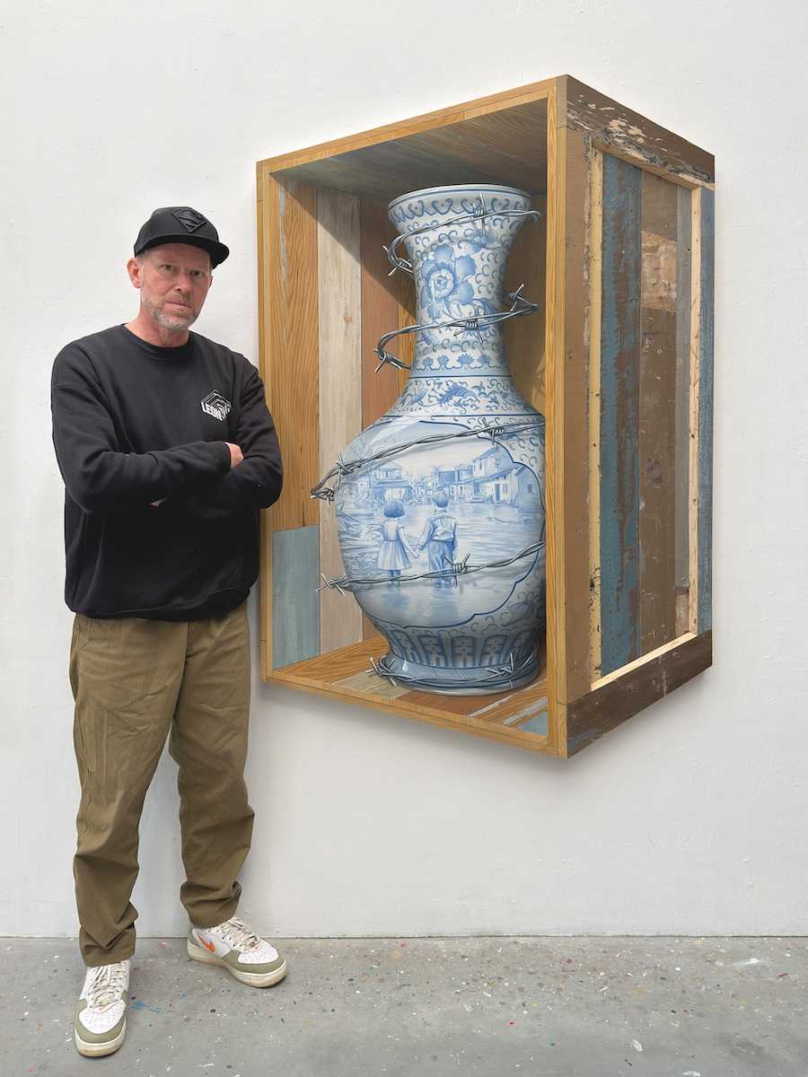 Parmi les pièces marquantes, Leon Keer, reconnu comme l’un des principaux artistes mondiaux du street art anamorphique, frappe fort avec « Delicate ». À première vue, une simple boîte d’emballage. Mais en s’approchant, l’illusion opère : une céramique de Delft hyperréaliste, délicatement protégée — ou enfermée — par un fil barbelé. Le contraste entre fragilité et contrainte, sublimé par un rendu 3D saisissant, interroge.