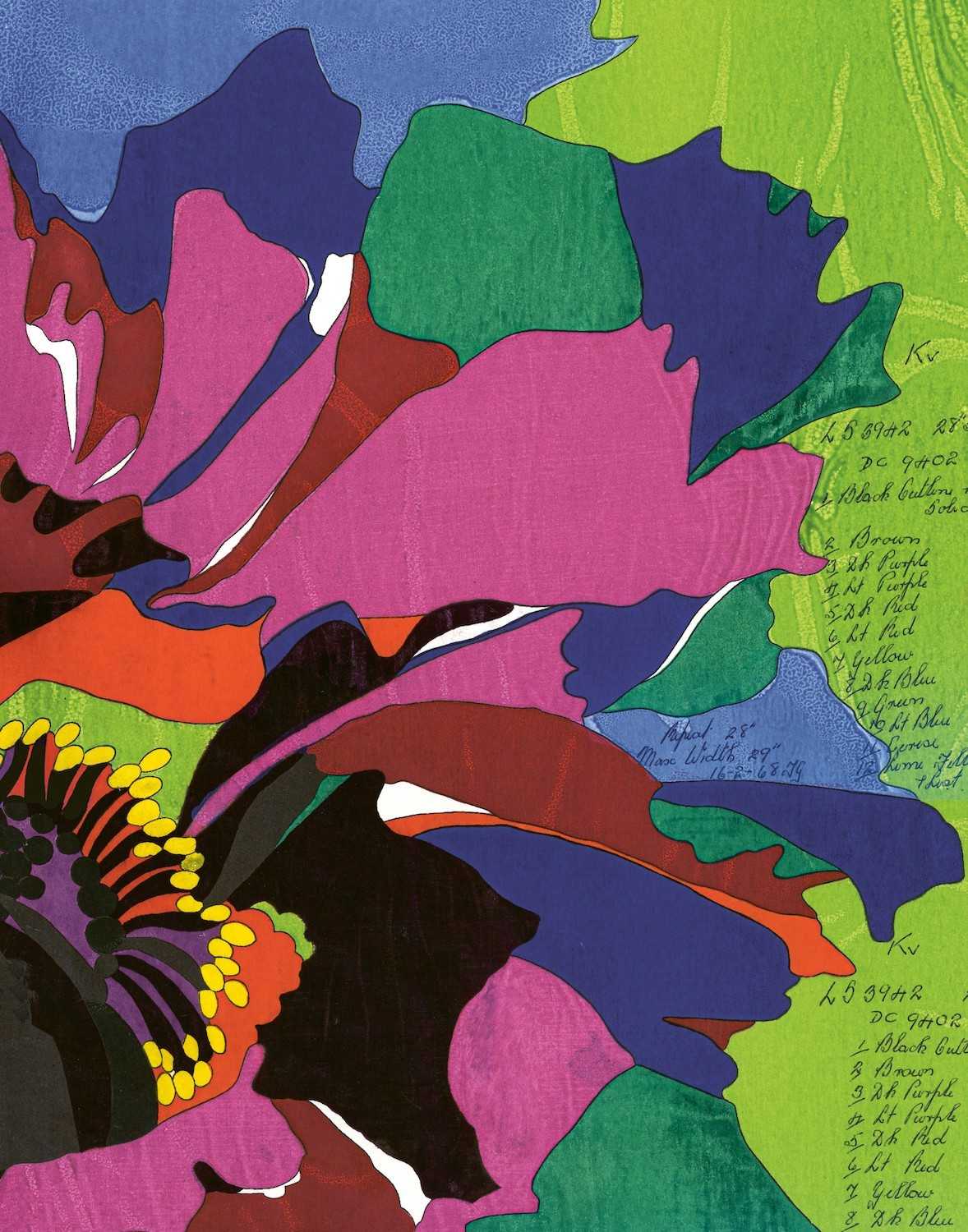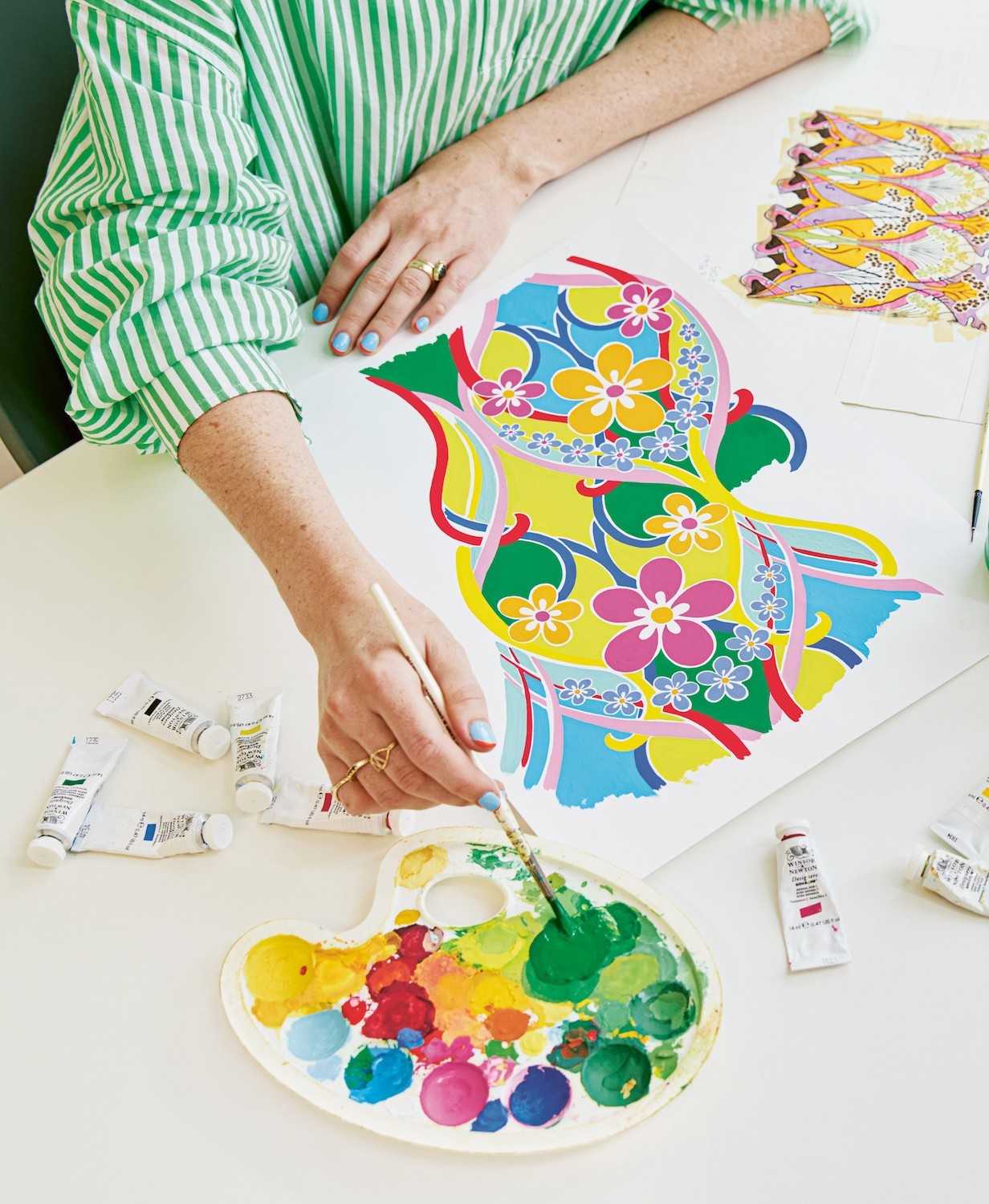 Photo ci-dessus : IONA FLOWER – Un membre du studio de design travaillant sur l’œuvre d’art aux couleurs vives qui allait devenir Iona Flower. © The Liberty Design Studio