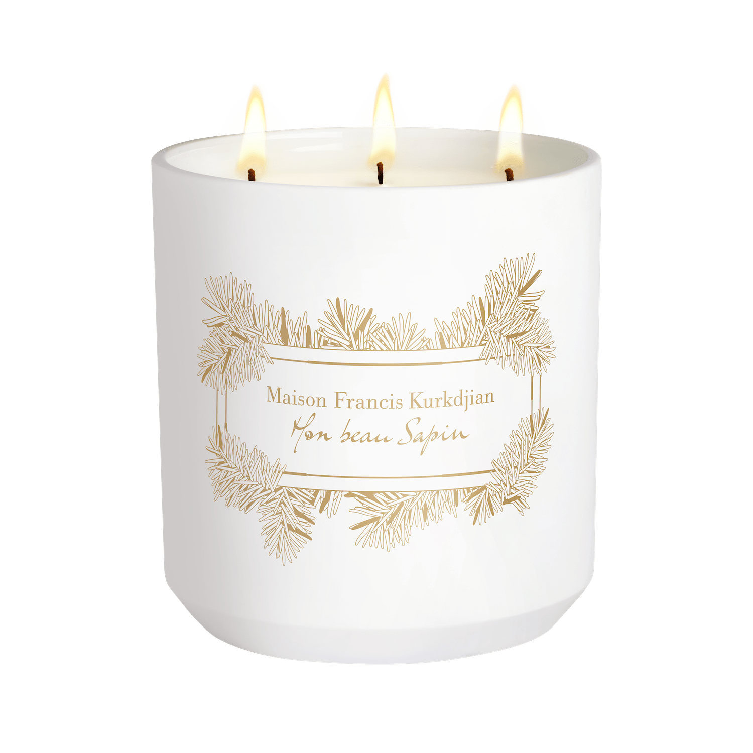 Autour de Mon beau Sapin, l’univers olfactif se prolonge et s’illumine à la lueur des bougies. Devenue emblématique, la fragrance se décline dans une collection pensée pour envelopper les intérieurs d’une aura festive. La bougie classique de 300 g côtoie cette année un format spectaculaire : 750 g, trois mèches, près de 118 heures de brûle. Un objet autant décoratif que sensoriel, lové dans un pot en porcelaine de Limoges, rehaussé d’un motif doré où le ruban iconique de la Maison s’entrelace aux aiguilles du sapin.