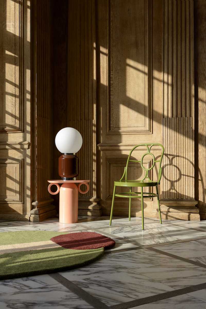 La collection s’enrichit également de créations inédites : une lampe outdoor nomade, pensée pour accompagner tous les instants de vie, une chaise en métal cintré réinventant avec élégance la chaise bistrot française, des tapis graphiques et audacieux qui deviennent des toiles au sol, une table basse laquée, élégante et décalée, véritable pièce maîtresse du salon.