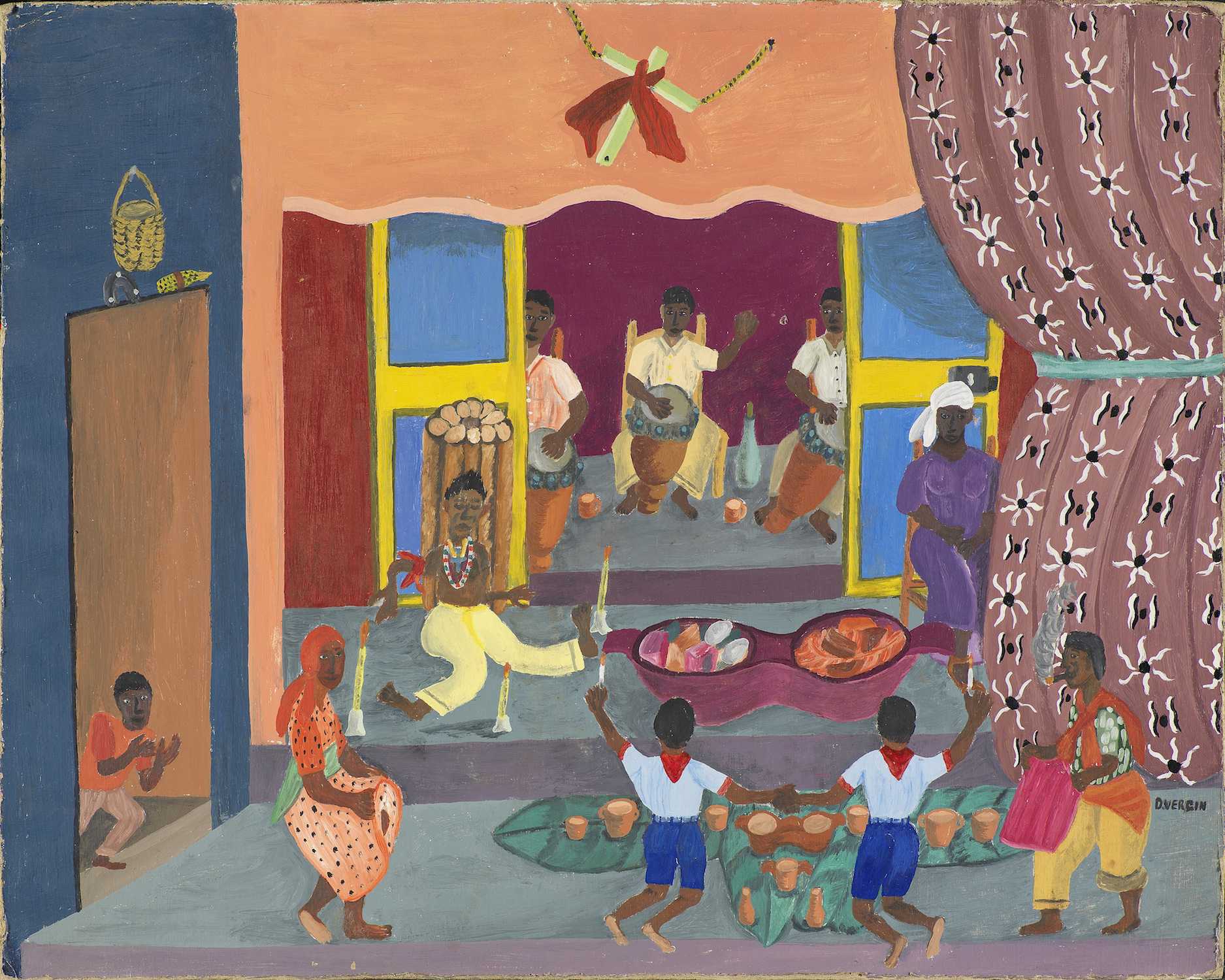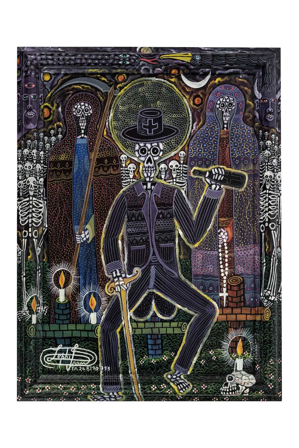 Photo ci-dessus : La danse de Baron Samedi 2023 – Frantz Zéphirin (né en 1968) – Acrylique sur isorel – Collection Erol Josué « Concierge des défunts », ce loa conduit les morts vers l’au-delà, et est le chef de la famille des Guédés (esprits de la mort). Très élégant, Baron Samedi porte une redingote noire, un haut-de-forme, une canne, des lunettes avec un verre cassé (signe de frontière entre la vie et la mort) et du coton dans les narines (comme on fait pour les cadavres).© musée des Confluences – Olivier Garcin